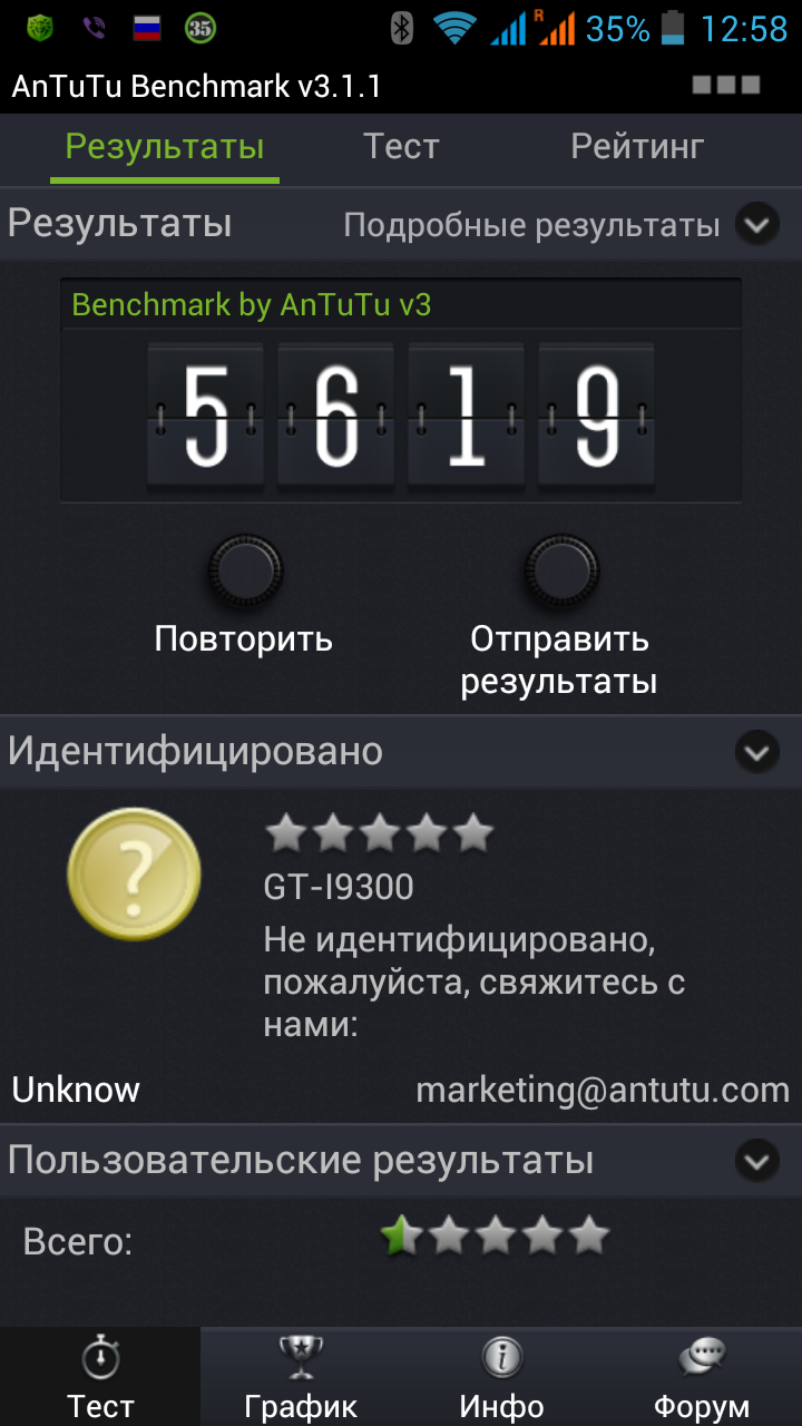 baska, Удивляет то, что казалось бы одинаковые аппараты, с одинаковыми прошивками показывают такие разные результаты. К тому же мой аппарат ещё и не идентифицируется в системе... Ты никаких примочек для разгона больше не ставил? А вот батарея хороша!